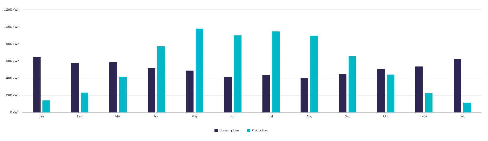 • In spring and summer, solar production exceeds usage